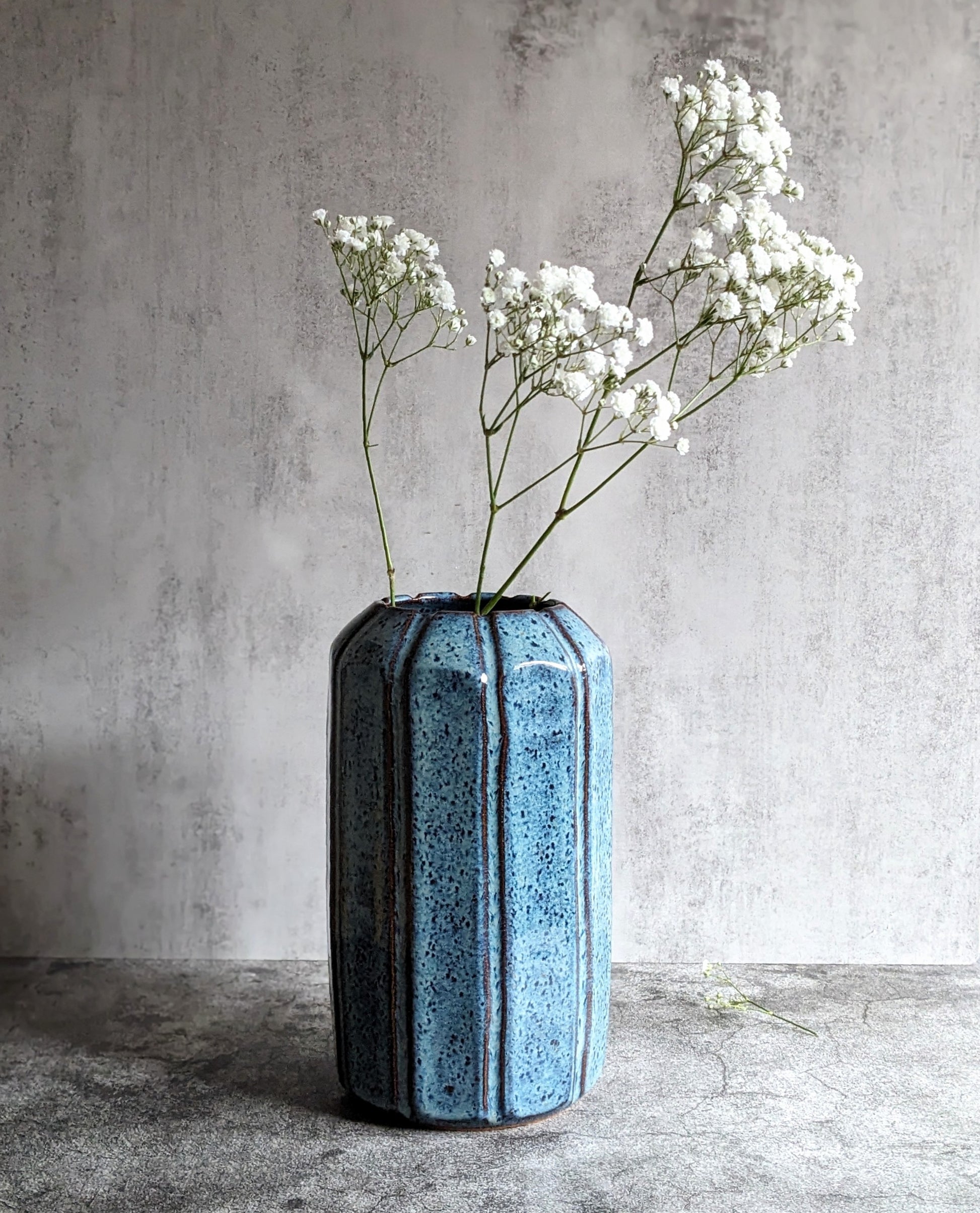 This unique large blue vase features a faceted cylindrical form highlighted by fluted corner details. Its rich blue speckled glaze is complemented by subtle brown undertones. Crafted by hand.