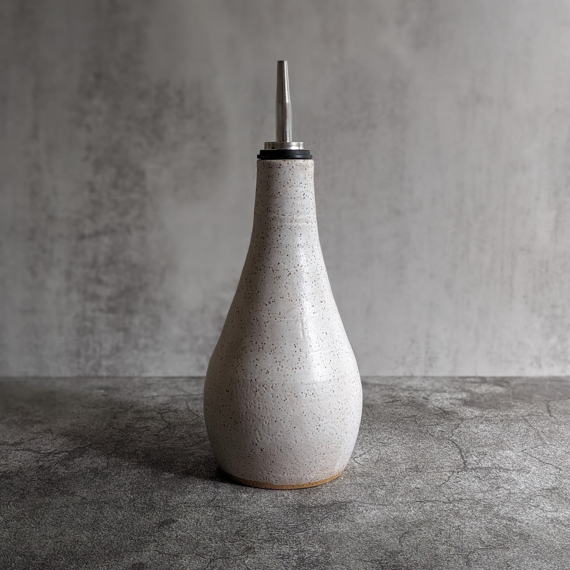 Elevate your kitchen with this handcrafted ceramic oil bottle, thoughtfully designed to combine elegance and practicality. Its white speckled finish adds a subtle texture that catches the light beautifully, making it a refined centerpiece for your countertop or dining table. Perfectly sized for olive oil, it provides controlled pouring, helping you enhance your culinary creations with ease. A lasting blend of form and function for the discerning home chef.