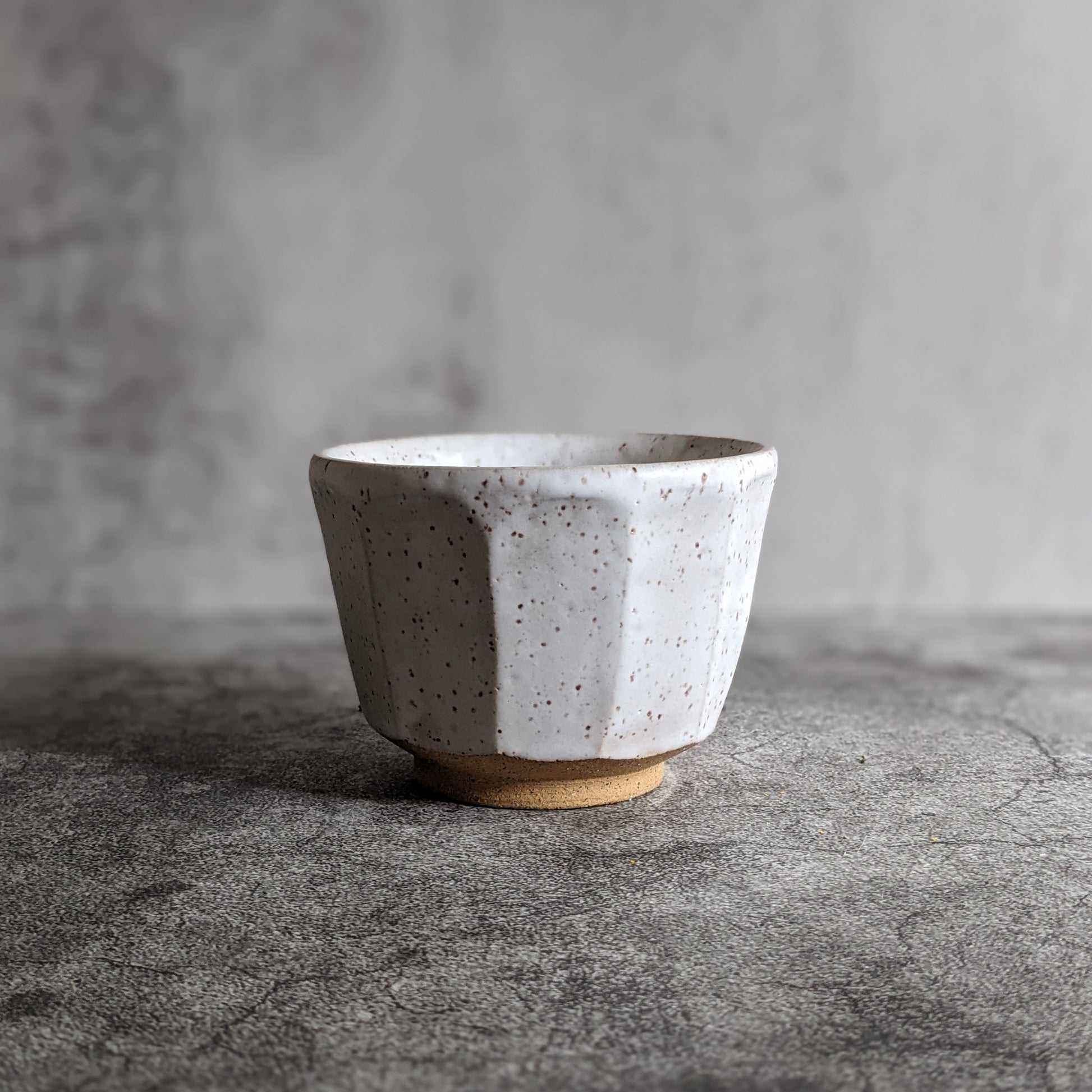 This petite handmade ceramic cup displays a refined speckled white faceted pattern and accommodates about 8 to 10 ounces, combining artisanal skill with understated elegance.
